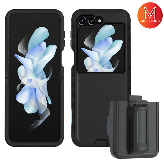 Samsung ZFlip 6 / ZFlip 5 OtterBox Style Defender Shockproof Case with Free Belt Clip Holster (Black)