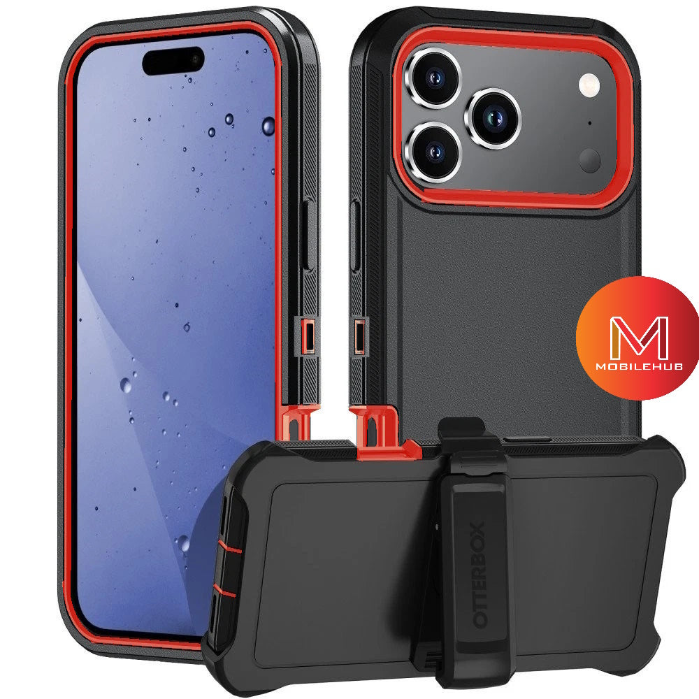 iPhone 17 / 17 Air / 17 Pro / 17 Pro Max Defender OtterBox Shockproof Case With Belt Clip Holster (Black / Orange)